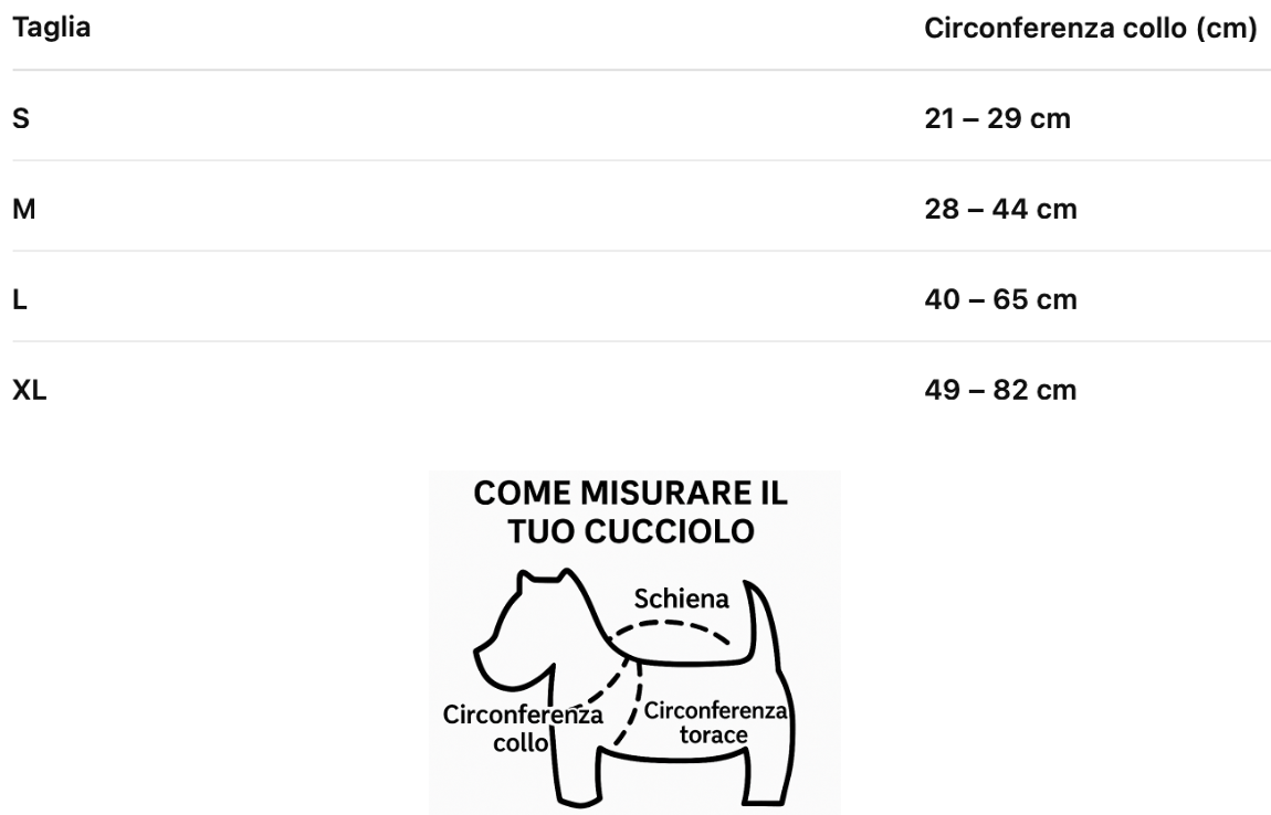 Disponibile in 4 taglie, è adatto a cani di piccola, media e grande taglia. Il sistema di regolazione antiscivolo permette una vestibilità personalizzata e stabile 📏🐾
